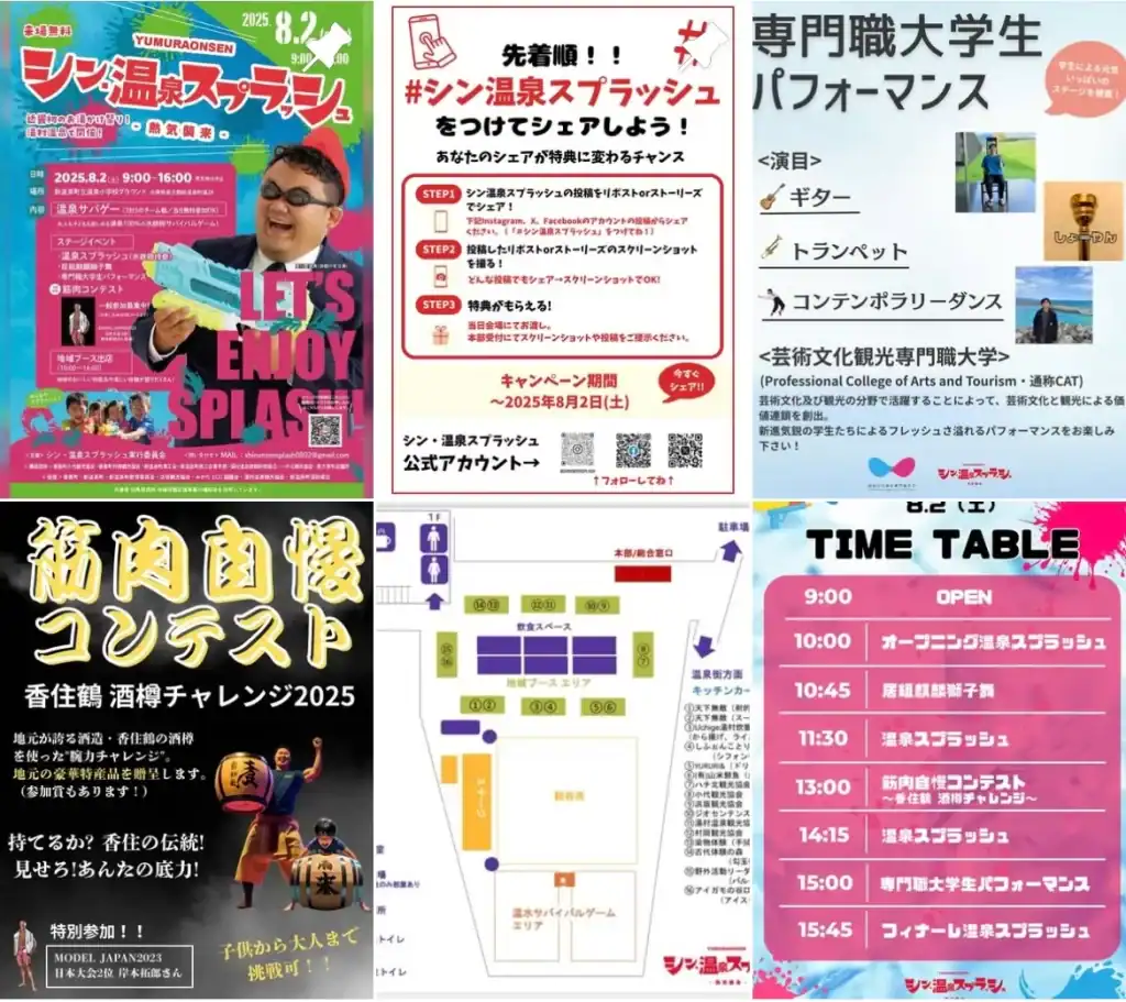 夏の暑さを吹き飛ばすお湯かけ祭り「シン温泉スプラッシュ」が開催されます。天然温泉を使った温泉サバゲーや 地域食たっぷり!地域ブース・キッチンカーが出店。家族で楽しめるアクティビティが盛りだくさん。地元の味や文化を楽しんでください。