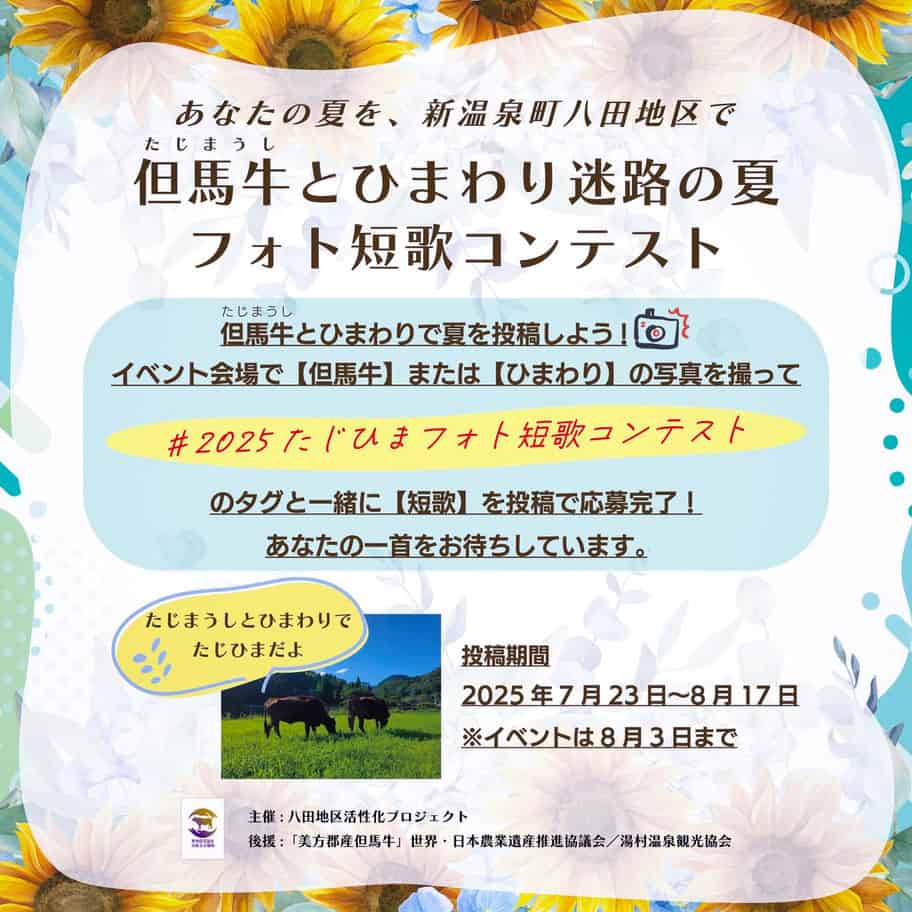ハッシュタグ「#2025たじひまフォト短歌コンテスト」をつけて「但馬牛」または「ひまわり」写真とともに短歌を投稿しよう!